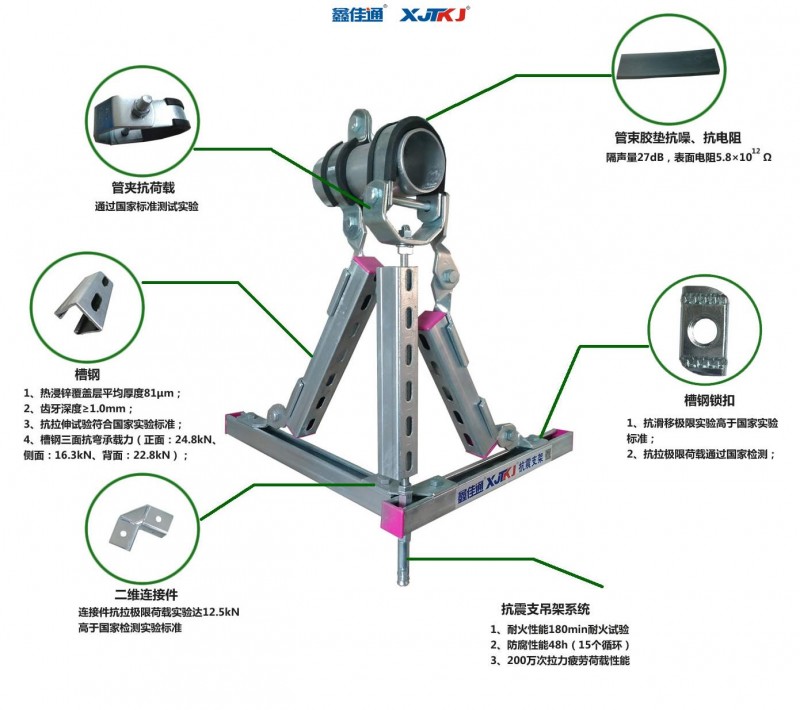 2、抗震支吊架為廠家生產(chǎn)的成品支架,在現(xiàn)場除型材切割外不需焊接和其它機(jī)械加工。U型槽鋼壁厚不小于2.0mm,連接件厚度不小于4mm,鋼材強(qiáng)度不低于Q235B;