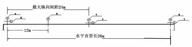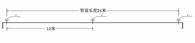 (1)剛性連接金屬管道長為24m,側(cè)向抗震支吊架最大間距12m,先于兩端加設側(cè)向支撐,再依次按12m 設置側(cè)向支撐(見圖6)。