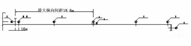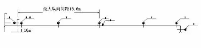 (4)縱向抗震支吊架最大間距24m,側(cè)向抗震支吊架最大間距12m,則雙向抗震支吊架距下一縱向抗震支吊架間距為:(24+12) /2+0.6=18.60m。詳見圖9。