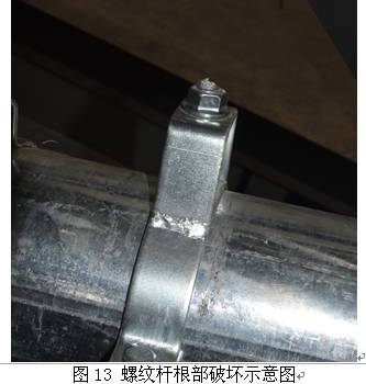 從這次的試驗(yàn)我們可以從中得出最直觀的結(jié)果是,右邊沒有做抗震加固只有承重支架的水管在地震后斷裂,而左邊做了抗震加固的水管還完好無(wú)損。特別說(shuō)明的是,在本試驗(yàn)進(jìn)行之前評(píng)估中心技術(shù)總監(jiān)還說(shuō),重力支撐系統(tǒng)用的16螺紋桿構(gòu)成的承重吊架,這個(gè)吊桿這么粗怎么可能會(huì)振的斷,一定振不斷。結(jié)果做上去之后,一按按鈕,模擬地震波發(fā)生之后,這個(gè)由一根16螺紋桿構(gòu)成的承重吊架震斷了,齊刷刷的被地震所產(chǎn)生的水平地震力及剪切應(yīng)力從吊桿的根部剪斷。