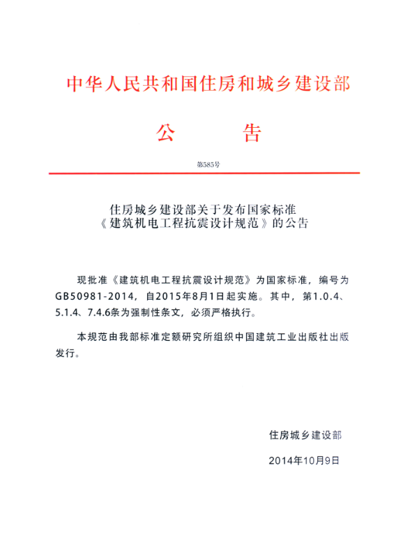 依據(jù)2015年住房城鄉(xiāng)建設(shè)部發(fā)布實(shí)施的國(guó)家標(biāo)準(zhǔn)GB50981-2014《建筑機(jī)電工程抗震設(shè)計(jì)規(guī)范》,其中明確規(guī)定了抗震支吊架的設(shè)計(jì)與使用。該標(biāo)準(zhǔn)自2015年8月1日起實(shí)施,也意味著自此之后的建筑機(jī)電工程必須要考慮抗震支吊架了。
