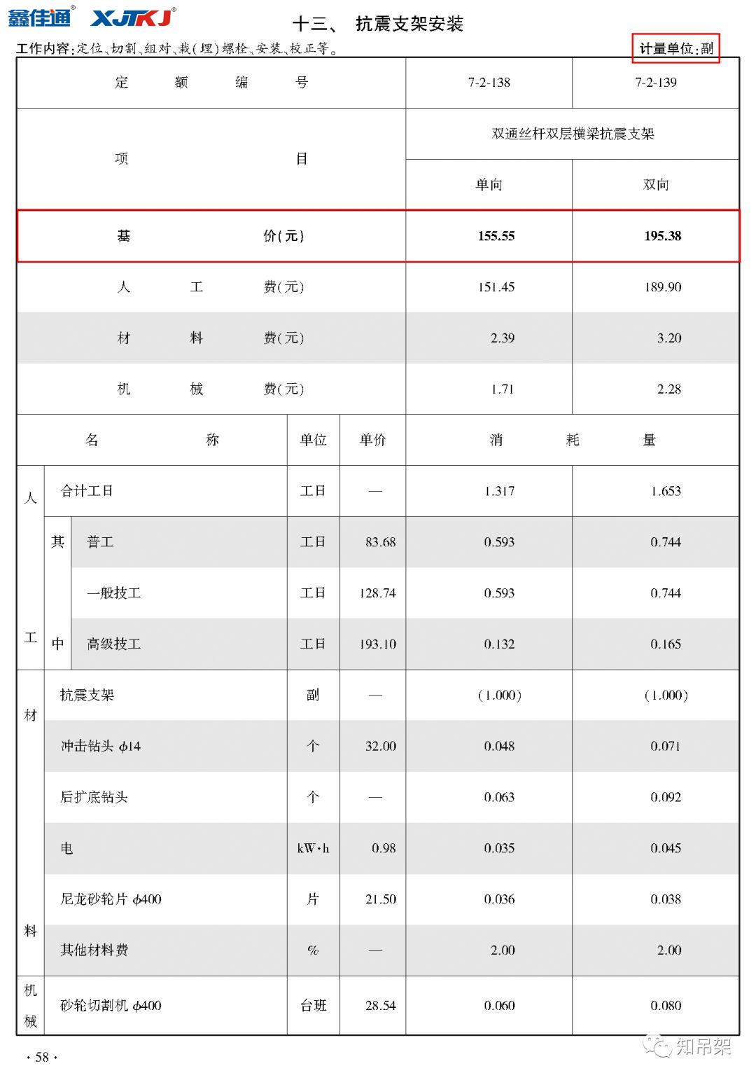第七冊通風(fēng)空調(diào)安裝工程中,抗震支架安裝工作內(nèi)容包括:定位、切割、組對、載(埋)螺栓、安裝、校正等。對于雙通絲桿雙層橫梁風(fēng)管抗震支架,擬按照單向抗震支架基價155.55元/副,雙向抗震支架基價195.38元/副。