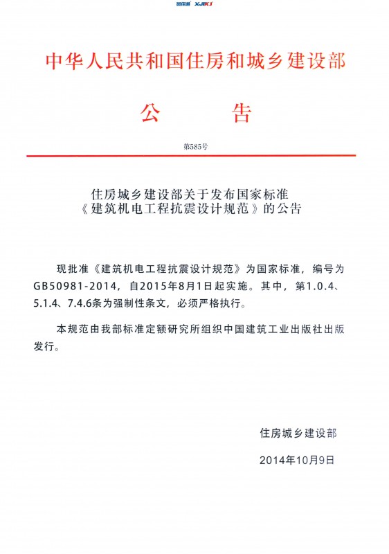 2014年10月9日,中華人民共和國(guó)住房和城鄉(xiāng)建設(shè)部第585號(hào)文件:住房城鄉(xiāng)建設(shè)部關(guān)于發(fā)布國(guó)家標(biāo)準(zhǔn)《建筑機(jī)電工程抗震設(shè)計(jì)規(guī)范》的公告,批準(zhǔn)《建筑機(jī)電工程抗震設(shè)計(jì)規(guī)范》為國(guó)家標(biāo)準(zhǔn),編號(hào)為GB50981-2014,自2015年8月1日起實(shí)施。其中,第1.0.4、5.1.4、7.4.6條為強(qiáng)制性條文,必須嚴(yán)格執(zhí)行。所以,自2015年8月1日之后出具圖紙或出具圖紙審查報(bào)告的工程,均需設(shè)置建筑機(jī)電工程抗震支吊架。
