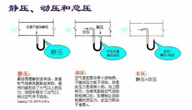 在選擇空調(diào)或離心風(fēng)機(jī)時(shí),常常會(huì)遇到靜壓、動(dòng)壓、全壓與余壓。根據(jù)流體力學(xué)知識(shí)。流體作用在單位面積上的垂直力稱為壓力,當(dāng)空氣沿風(fēng)管內(nèi)壁流動(dòng)時(shí),其壓力可分為靜壓、動(dòng)壓和全壓。單位分別為mmHg或kg/㎡或Pa。