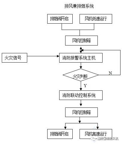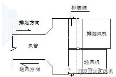 該系統(tǒng)通風(fēng)機出風(fēng)口設(shè)置防火閥,排煙機出風(fēng)口設(shè)置排煙閥,風(fēng)管中設(shè)置排煙閥(常開)。該系統(tǒng)排風(fēng)與排煙的方向相反。