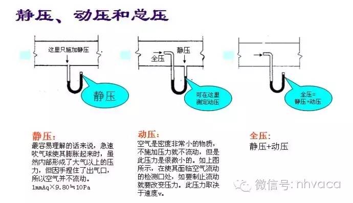 由于空氣分子不規(guī)則運動而撞擊于管壁上產(chǎn)生的壓力稱為靜壓。計算時,以絕對真空為計算零點的靜壓稱為絕對靜壓。以大氣壓力為零點的靜壓稱為相對靜壓。空調(diào)中的空氣靜壓均指相對靜壓。