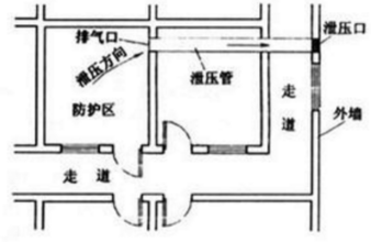 若多個(gè)房間設(shè)計(jì)成一個(gè)氣體防護(hù)區(qū),其泄壓口的設(shè)置方法可照此進(jìn)行。 實(shí)例三如圖4所示,防護(hù)區(qū)沒有外墻,其泄壓口的設(shè)置方法為在防護(hù)區(qū)上部開設(shè)排氣口.排氣口面積與泄壓口面積相等,在外墻的適當(dāng)位置開設(shè)泄壓口,排氣口與泄壓口之間用一單獨(dú)設(shè)置的泄壓管相連,這樣就可以將防護(hù)區(qū)超壓的氣體直接排到建筑物外,真正做到符合消防規(guī)范的要求。