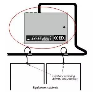 典型的吸氣式感煙火災(zāi)探測(cè)器的安裝方式,所有盤內(nèi)的空氣樣品透過(guò)軟管匯流到采樣管送到探測(cè)主機(jī)進(jìn)行煙霧檢測(cè),利用管路及軟管抽取機(jī)柜內(nèi)部的空氣進(jìn)行分析。