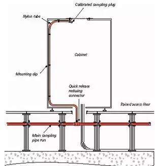 吸氣式感煙火災(zāi)探測(cè)器的采樣管路配置相當(dāng)靈活,采樣管可以配置在機(jī)柜上方,利用軟管及機(jī)柜上方的開(kāi)孔即可抽取機(jī)柜內(nèi)部的空氣。采樣管路也可以配置在機(jī)柜下方,利用軟管延伸到機(jī)柜內(nèi)部的頂端來(lái)抽取空氣樣本。