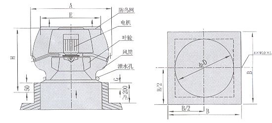 b、離心式屋頂風(fēng)機(jī):代號(hào)為DWT-II,型、DWT-III型二種型式,適用于風(fēng)量較小而壓力要求較高的場(chǎng)合。